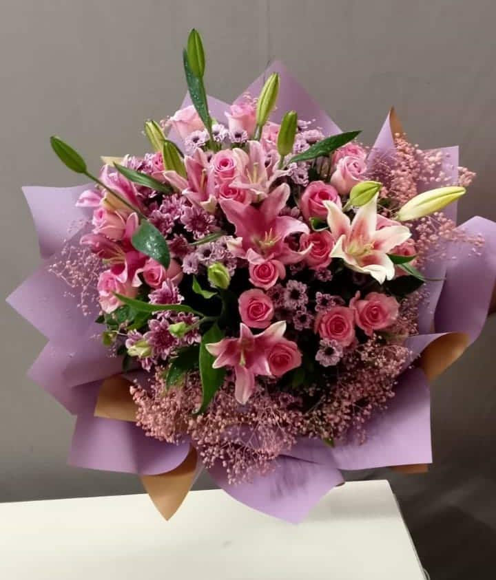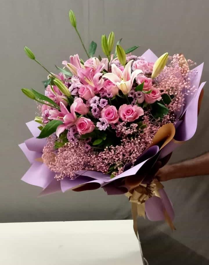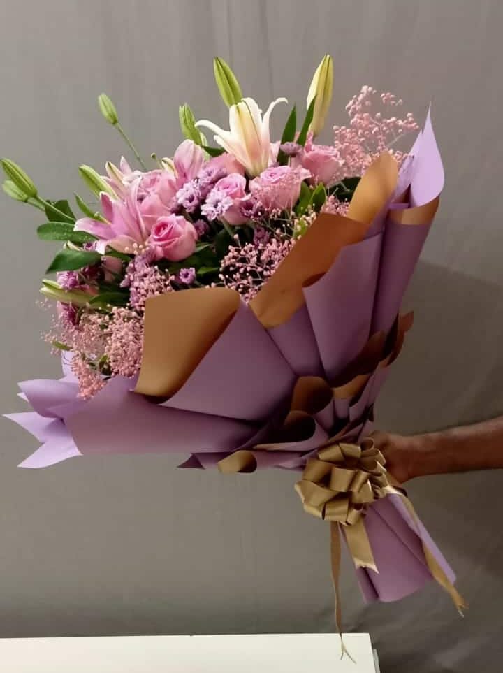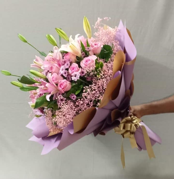 Celebrate love, elegance, and heartfelt emotions with our Elegant Pink Harmony Bouquet, thoughtfully handcrafted to impress. This luxurious floral arrangement blends the romantic charm of pink roses with the graceful beauty of pink oriental lilies, symbolizing admiration, purity, and affection.