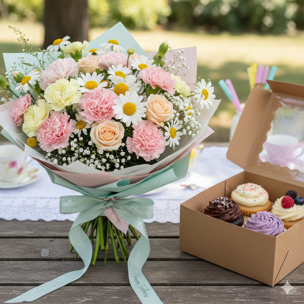 This flowers and cake gift combo brings a joyful mix of pastel blooms and delicious cupcakes in one cheerful surprise. The bouquet features a lively blend of roses, carnations, and daisies, paired with airy gypsophila and eucalyptus for a fresh, spring-inspired look that instantly brightens any moment.